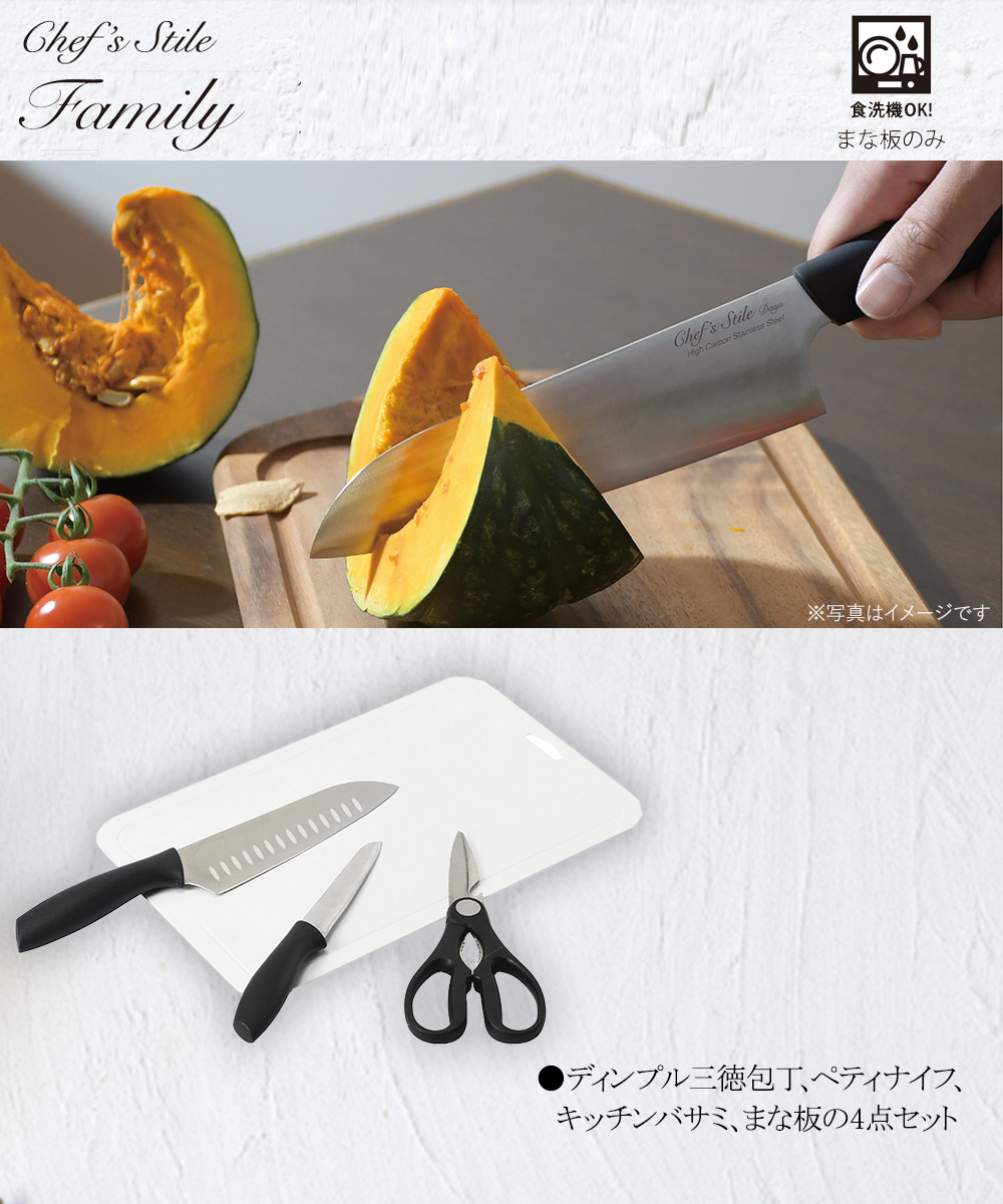 三徳包丁・ペティナイフ・キッチンバサミ・まな板の4点セット。まな板は食器洗い乾燥機対応。