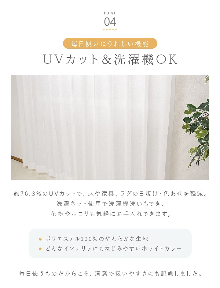 ・届いてすぐ使えるレースカーテンです。 ・生地はやわらかな質感です。 ・花粉キャッチ-紡績によるフィルター状の生地を使用。外からの花粉の侵入を防ぎます。洗濯で取り除くことができ、機能は失われません。 ・省エネ-保温・保冷の効果があり、エアコンを効率的に稼動します。 ・遮像レース-内からも外からも透けにくい加工を施しています。 ・UVカット-UVカット率約76.30%。お部屋の中の紫外線対策に。 ※画面上のカラーをブラウザや設定により、実物とは若干異なる場合がございます。あらかじめご了承の上、ご注文をお願いいたします。 | |