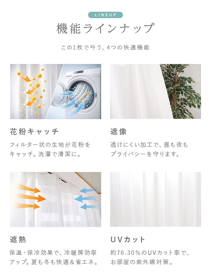 | 機能 | 花粉キャッチ、遮熱、遮像、UVカット |