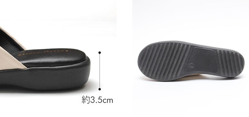 ヒール部分は程よい高さがあり、足元をすっきり見せてくれます。 | ソール部分は汚れに強いEVA素材を使用しています。 | |