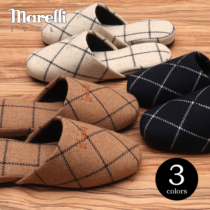 イタリアの紳士靴ブランド「マレリー」のブランドロゴを刺繍で施した定番の吊り込みスリッパ。シックなウインドウペンチェックの日本製のスリッパです。寒い時期の自宅用はもちろん、来客用にもぴったりな品質確かな日本製のスリッパです。