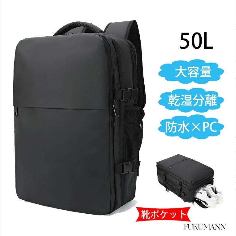 ビジネスリュック メンズ 50l 大容量 防水 ビジネス リュック バッグ a4 pc usbポート 多機能 靴 収納 出張 旅行 ジム 防災 ナイロン 黒 ペットボトル 2way