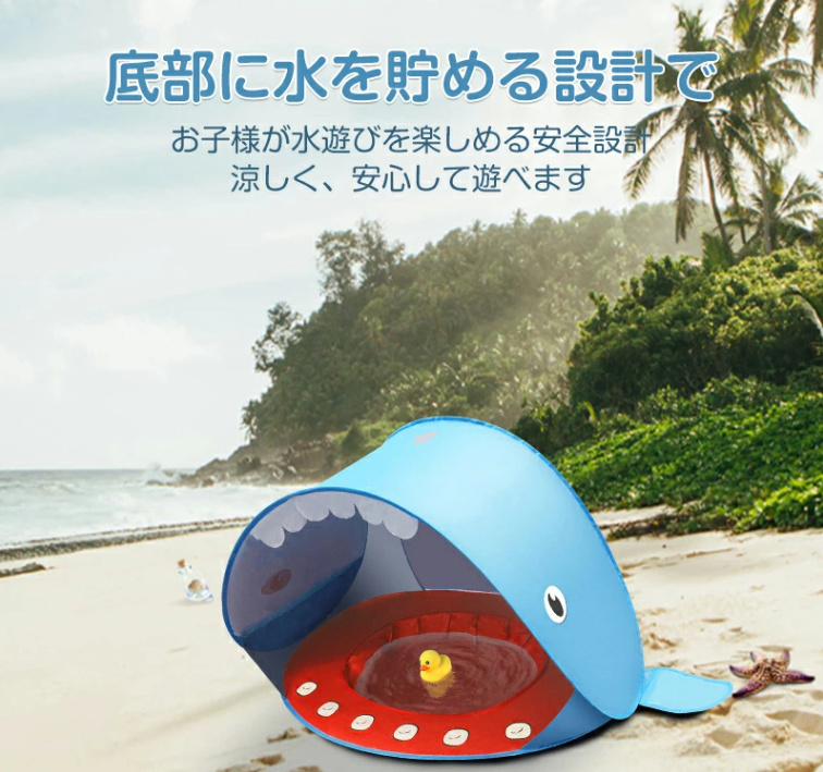 特徴:折りたたみ式、ワンタッチ設営、水貯め設計、UVカット、通気性良好