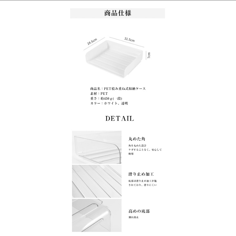 透明素材:透明素材を使用しており、必要なアイテムをすぐに見つけられ、整理された状態を保ちながら内容物を見せることができます。