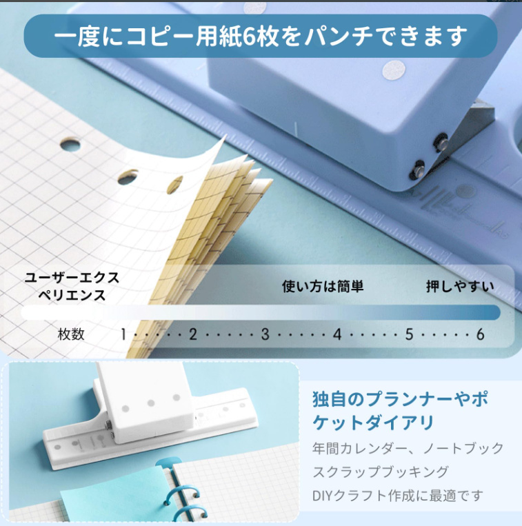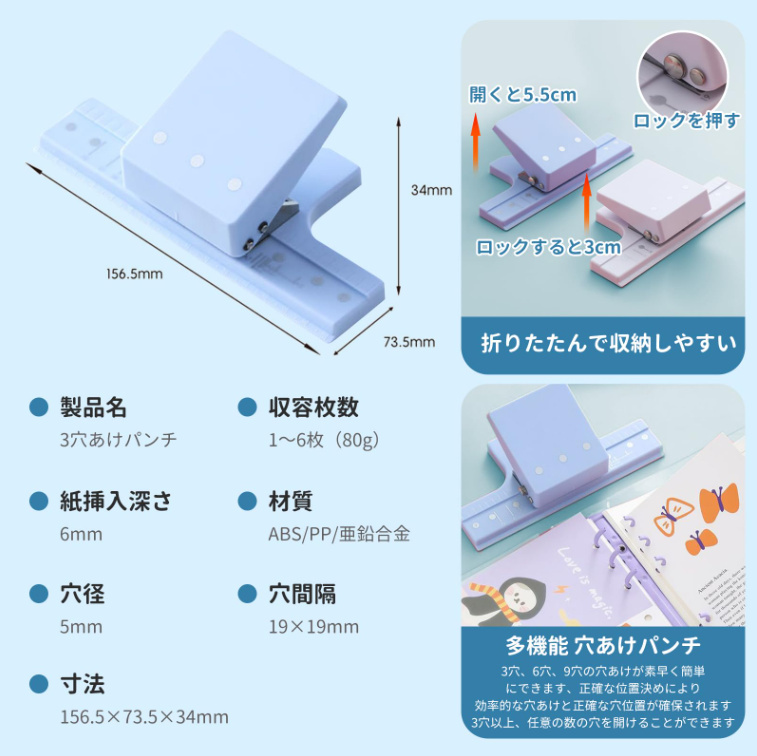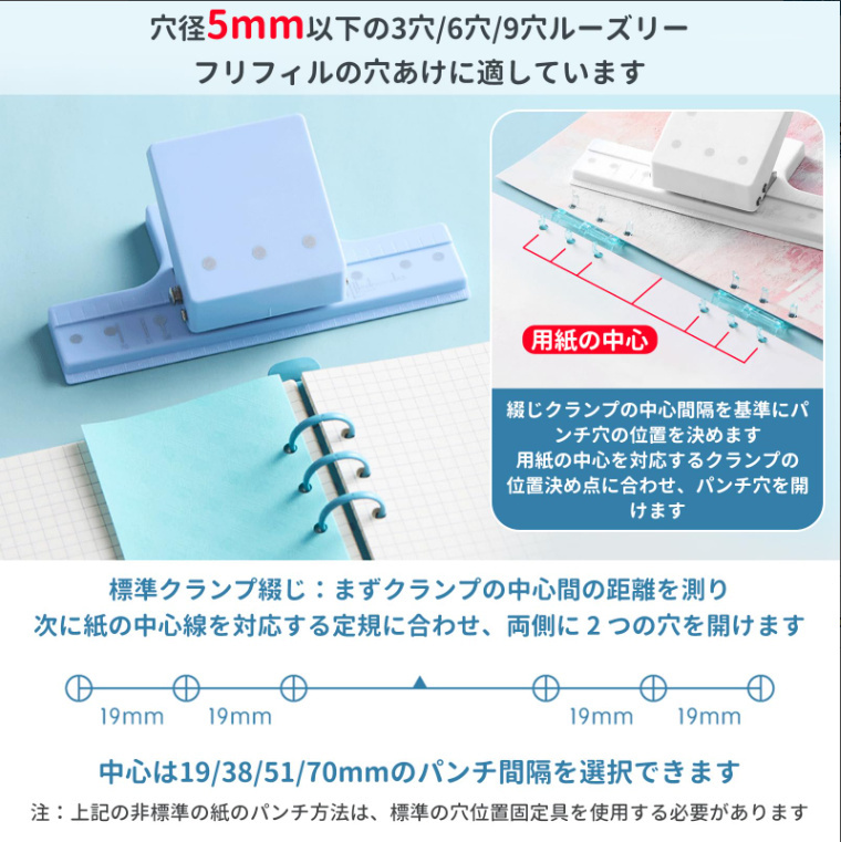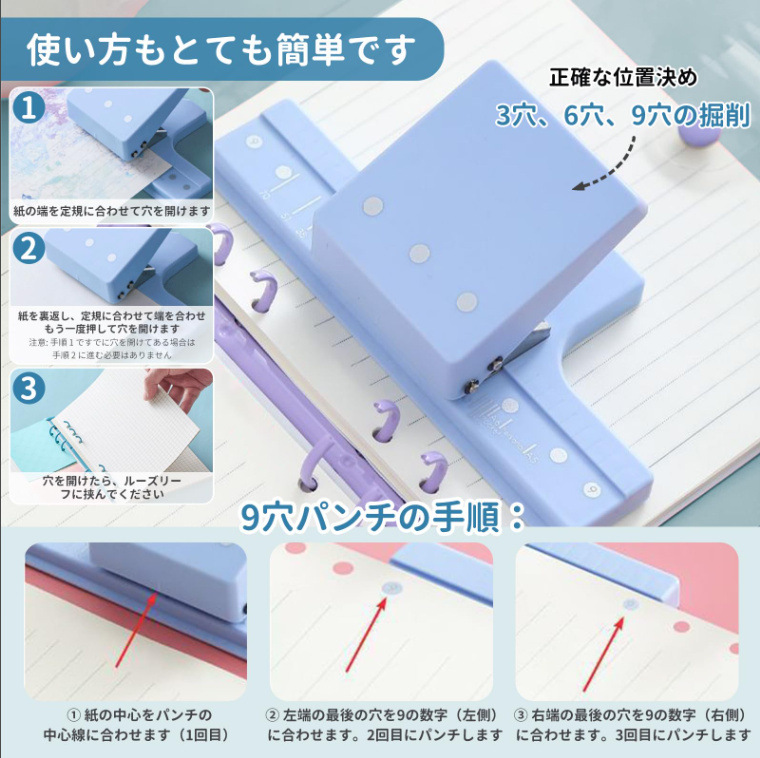 ルーズリーフパンチ 3穴 6穴 9穴 穴あけパンチ 穴あき 穴開け スクラップブッキング用品用 B5 A5 A6 対応 穴径5mm以下 軽量 DIY ノート 手帳作り