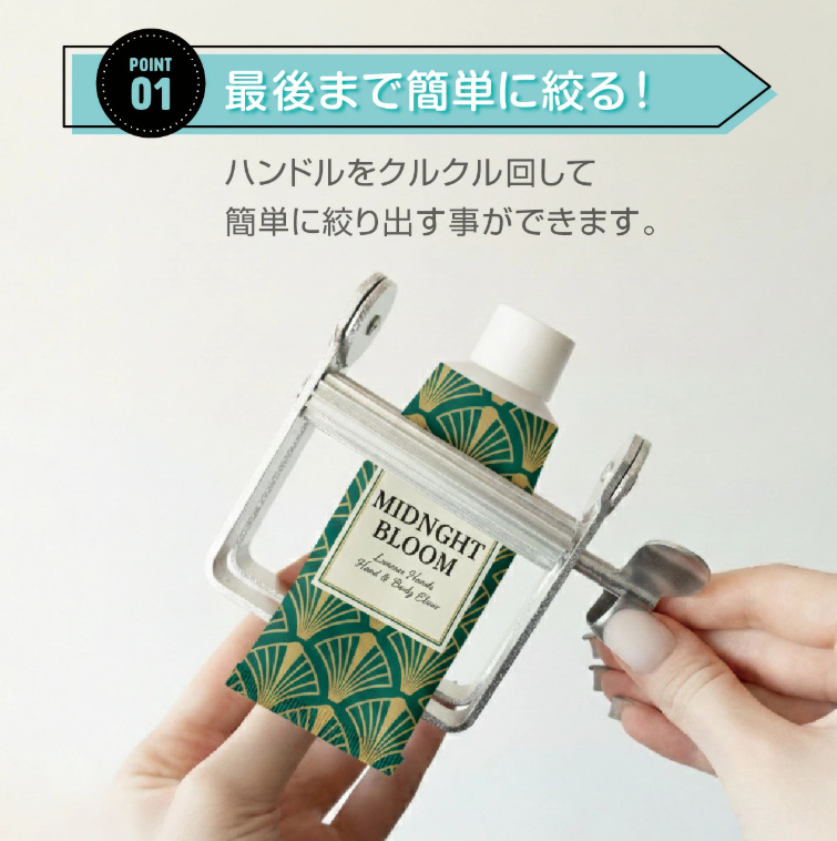 最後まで簡単に絞れる:ハンドルをクルクル回すだけで、中身を奥からしっかり押し出します。