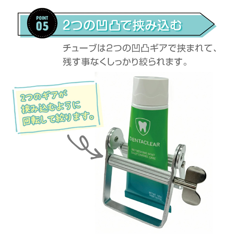 2つの凹凸ギアでしっかり挟む:チューブを均等に押し出し、残りにくい構造。