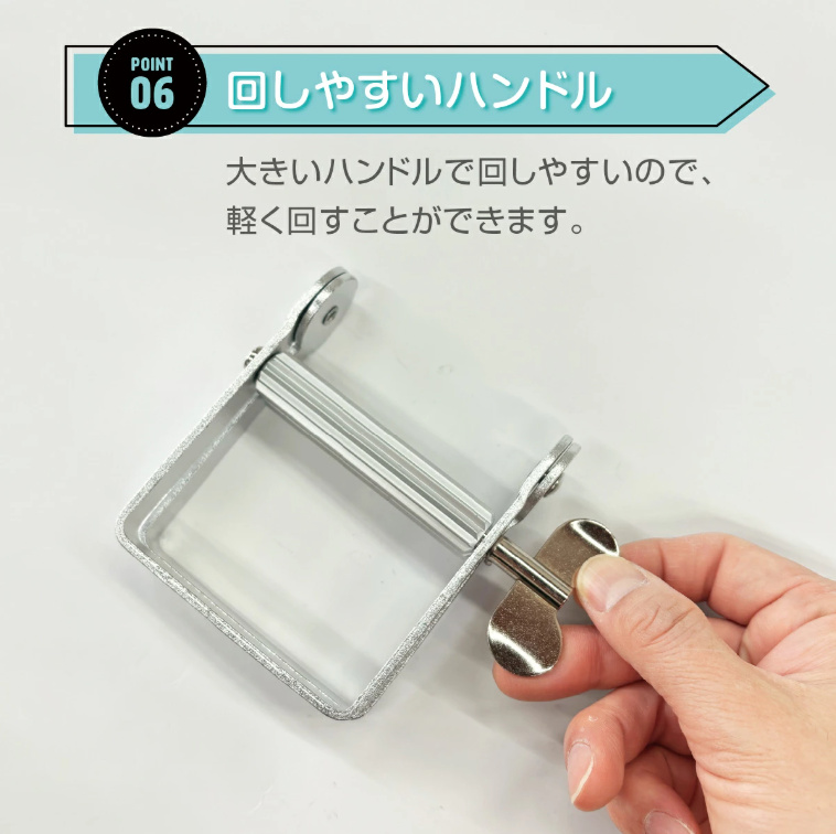 簡単操作:チューブを挟んで回すだけ。力の弱い方でも扱いやすい設計です。