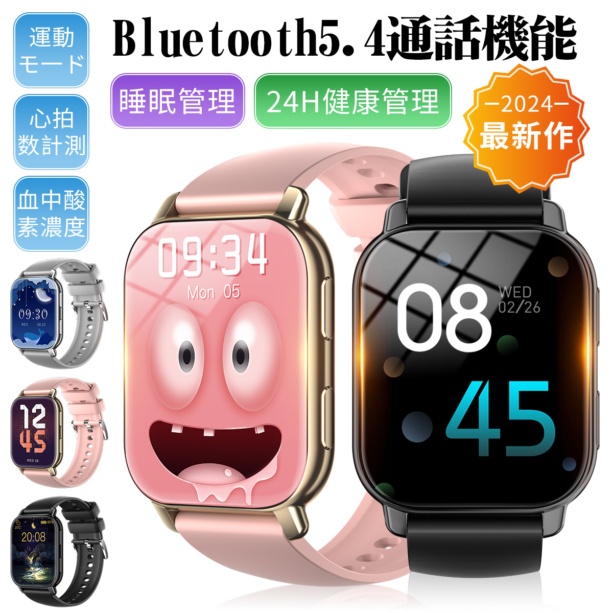 スマートウォッチ 血糖値 血圧測定 血中酸素 心拍数 着信通知 女性生理健康管理 睡眠検測 体温測定 歩数計 音楽再生 カメラ制御 IP67防水 腕上げ点灯 天気予報