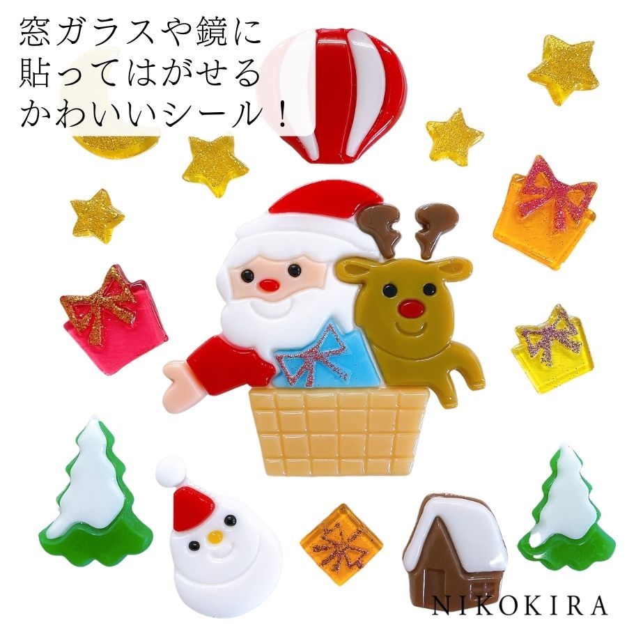 | 商品説明 | サンタさんとトナカイが仲良く一緒にバルーンに乗ってプレゼントの配達に出発! キラキラのラメ入りのパーツもあり、華やかでかわいいデザインです。 プルンとしたゼリーのような質感と、宝石のような美しい発色。 窓ガラスや鏡に簡単に貼ったり、はがしたりできるアルゼンチン生まれのウインドーディスプレイグッズです。 シーズン・イベントに合わせて楽しめるように、豊富な種類とデザインを取りそろえています。 シールとは違い、何度でも貼ったりはがしたりできるので、同じパーツで組み合わせやアレンジをくり返し楽しむことができるのが特徴です。 大人から子供まで安心して楽しんでもらいたいという想いから安全性も重視しています。 日本では食品添加物等の規格に準じた試験済み、アメリカではASTMの基準でテスト済みです。 ※ご使用前には必ず使用上のご注意をお読みください。 |