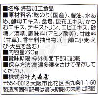| 原材料名 | 乾のり(国産)、醤油、水あめ、酵母エキス、 食塩、昆布エキス、かつおエキス、デキストリン、 エビエキス、砂糖/酒精、調味料(アミノ酸等)、 甘味料(甘草)、香辛料抽出物、(一部に小麦・えび・大豆を含む) |