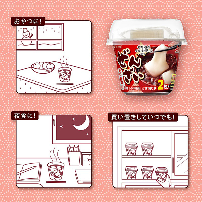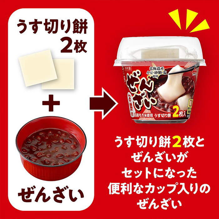 ぜんざいは北海道産小豆、砂糖、塩を使用し、お餅は国産もち米100%使用の個装うす切り餅を2枚入れました。