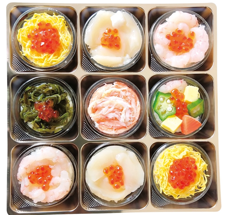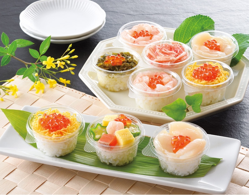 北海道産米純米酢を使った酢飯に、北海道産のほたて・いくら・紅ズワイガニをはじめ、甘えびやサーモン、めかぶと彩り豊かな素材を乗せ、直径5cmほどのカップ寿司に仕上げました