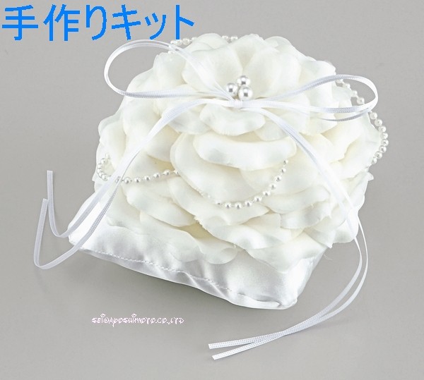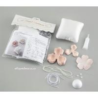説明書・花形土台2枚・発砲スチロール1個・白パールの紐1本・ワイヤー3本・クッション1個・粘着剤1個・白リボン2本・白パール3個・花弁(大)ビロード11枚、オーガンジー11枚・花弁(小)ビロード2枚、オーガンジー2枚・3mm幅のリボン1本・6mm幅のリボン1本入りです。