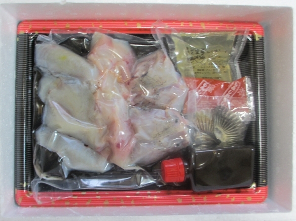 とらふぐ切身2501g、とらふぐひれ3枚、ぽん酢150ml、鍋つゆ60g、もみじおろし16g入りのギフトセットです。