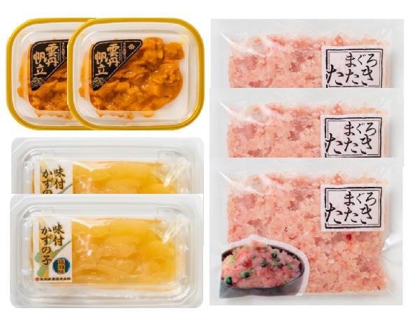 うにほたて(うに魚醤入)70g・味付け数の子醤油味60g×各2、まぐろたたき80g×2入りのギフトセットです。