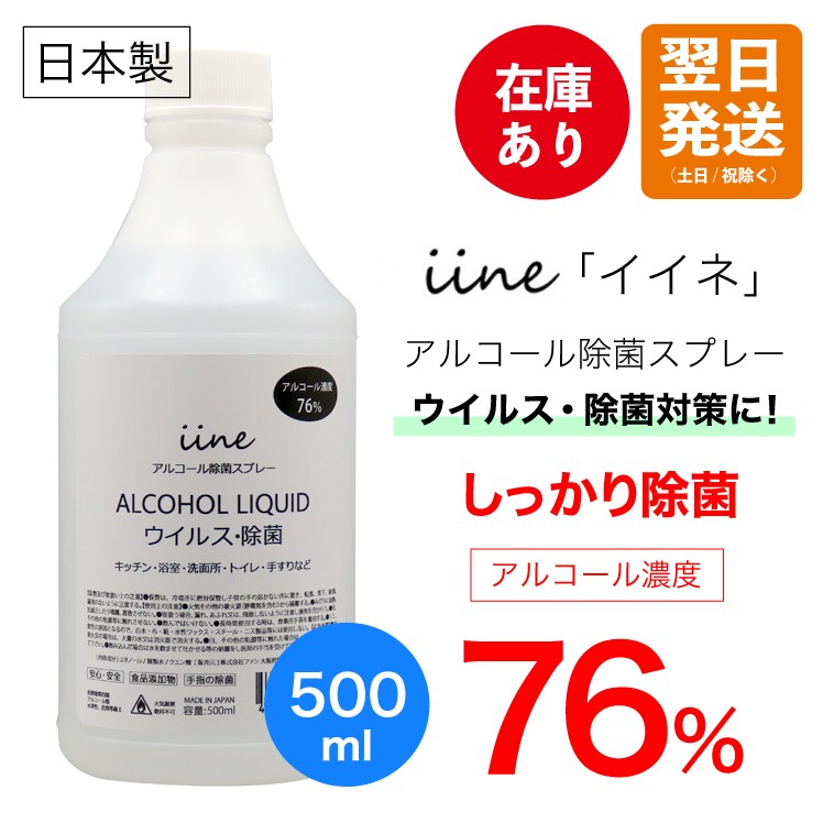 アルコール除菌剤 イイネ iine(500ml)日本製 高濃度 濃度76% 食品添加物由来 除菌用エタノール 業務用アルコール除菌液 除菌剤 高濃度