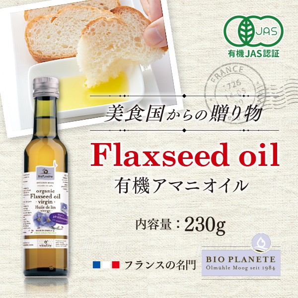 アマニオイル 有機 BIOPLANETE オーガニックJAS認証 フランス産 ドイツ産 230g (コールドプレス製法・アマニ油・亜麻仁油・フラックスシードオイル)