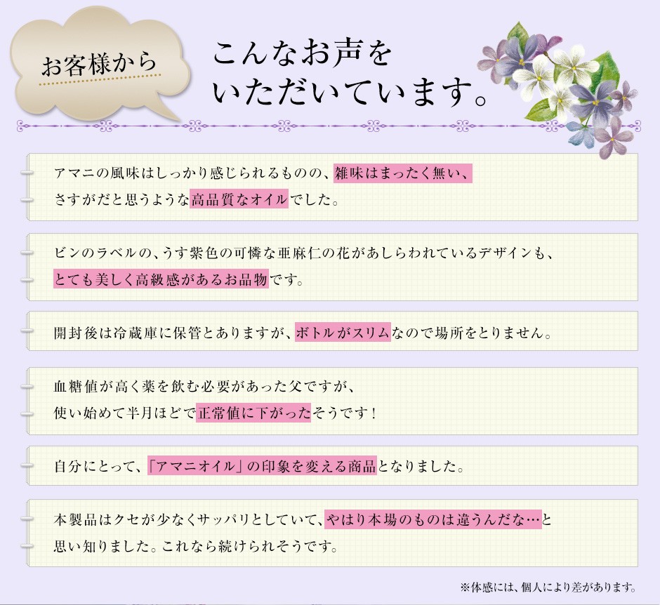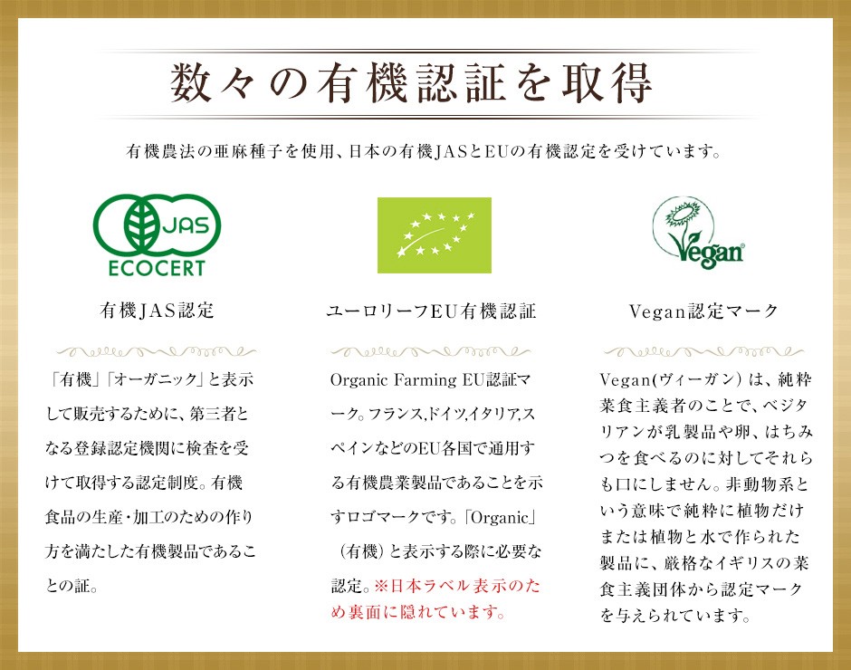 主にフランスの他、ヨーロッパ原産の新鮮な有機栽培された亜麻の種子を100%使用し、低温圧搾(コールドプレス)で抽出された無精製・無添加のピュアなオーガニックアマニオイルです。