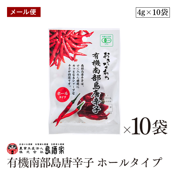 【メール便】おきなわの有機南部島唐辛子 ホールタイプ 4g 10袋セット 平袋 島酒家 オーガニック スパイス 辛味 とうがらし 有機JAS 唐辛子 沖縄県 国産