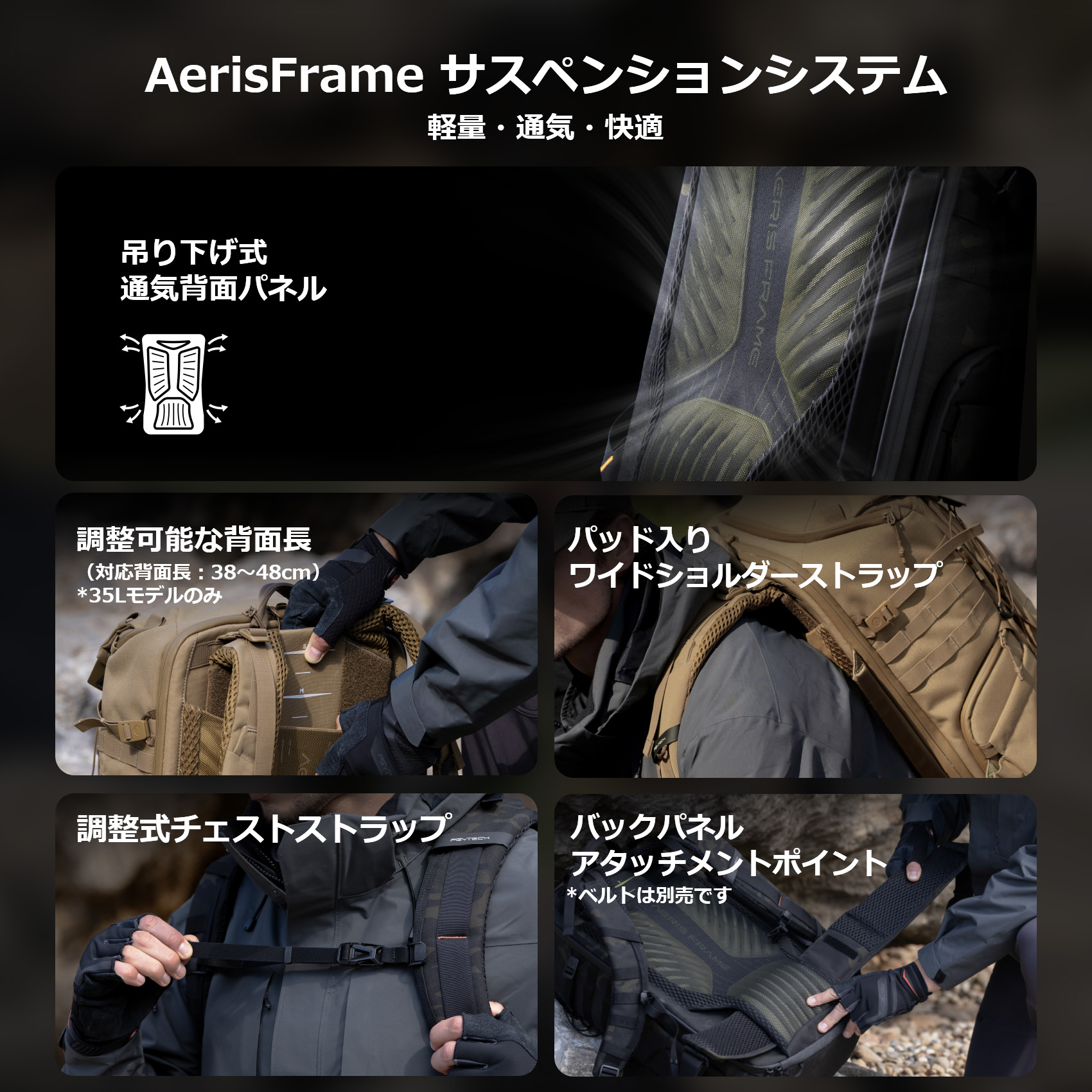 【エアリスフレームサスペンションシステム】通気性のあるサスペンション式背面パネルが背中の形状にフィットし、安定した快適な背負い心地を実現。厚手のパッド入りワイドショルダーストラップと調節可能なチェストストラップが肩への負担を効果的に軽減。背面パネルにはオプションのウエストベルト用アタッチメントポイントも装備され、荷重を全身に分散可能。(ウエストベルトは別売りです。単体で写真用ウエストベルトとしても使用可)