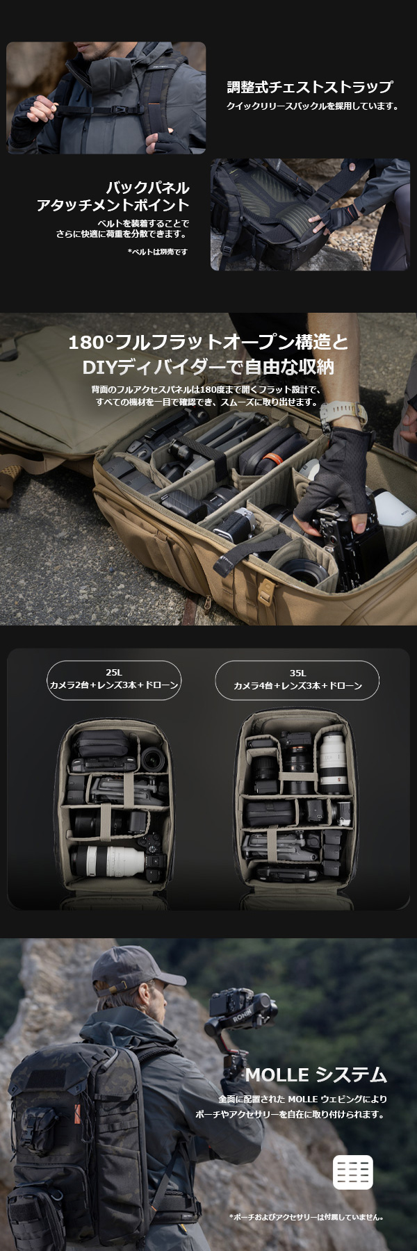 【クイックアクセス】【25L】左側クイックアクセス開口部。短焦点レンズのカメラセットアップへの容易なアクセスと素早いバッテリー交換を可能にします。【35L】左側&上部クイックアクセス開口部。長焦点レンズのカメラセットアップを素早く簡単に取り出せます。