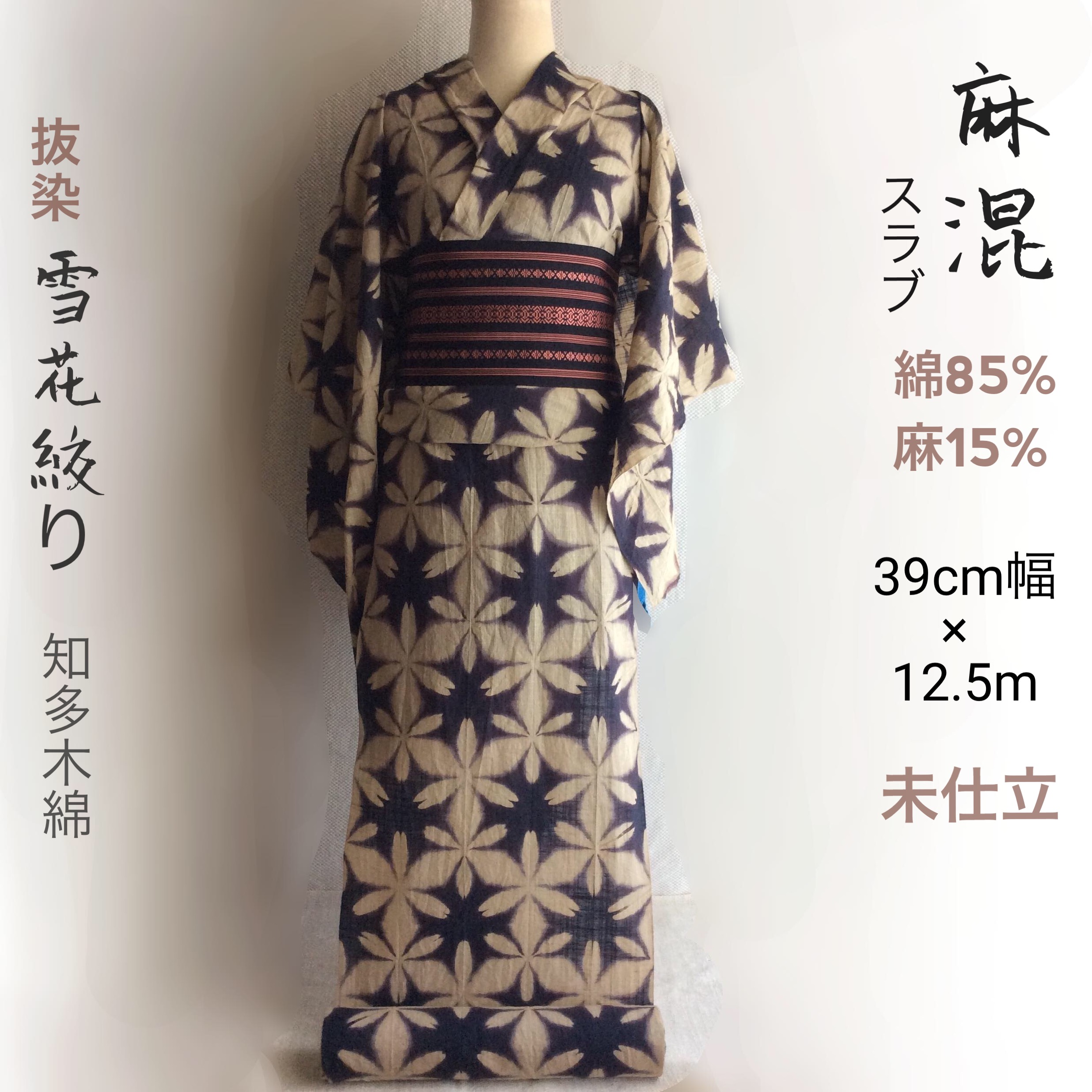 麻混スラブ浴衣反物 知多木綿 未仕立て 黒の抜染雪花絞り