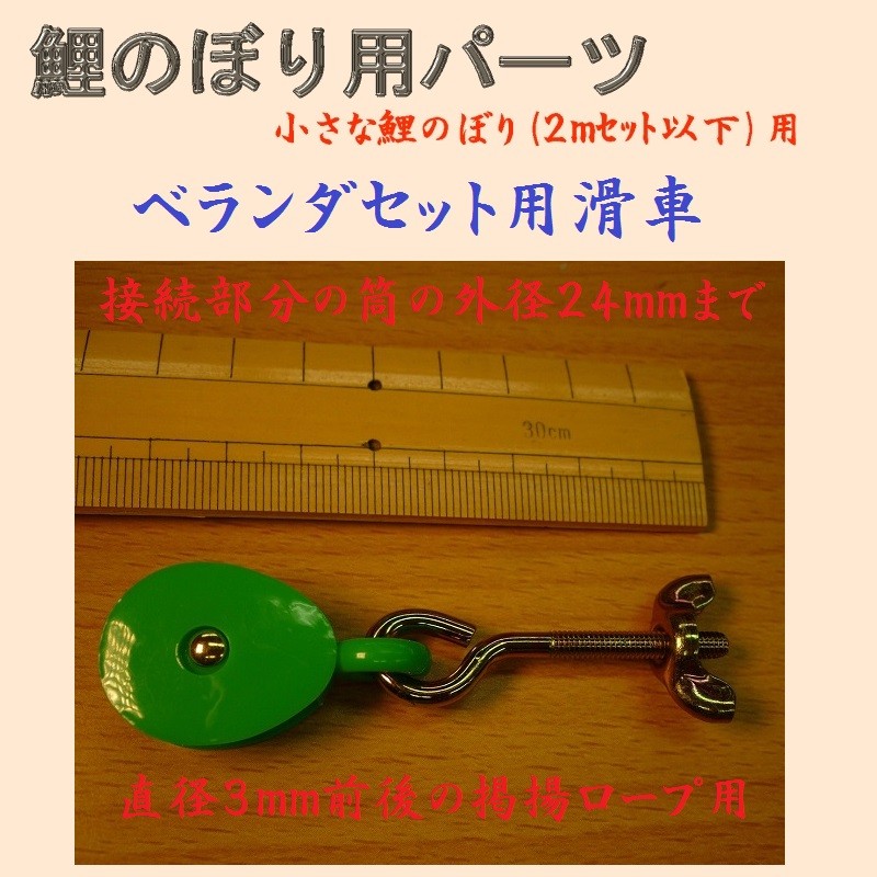 ベランダ用鯉幟を掲揚する際の矢車とポールの接続部分に付ける、掲揚ロープ用の滑車です