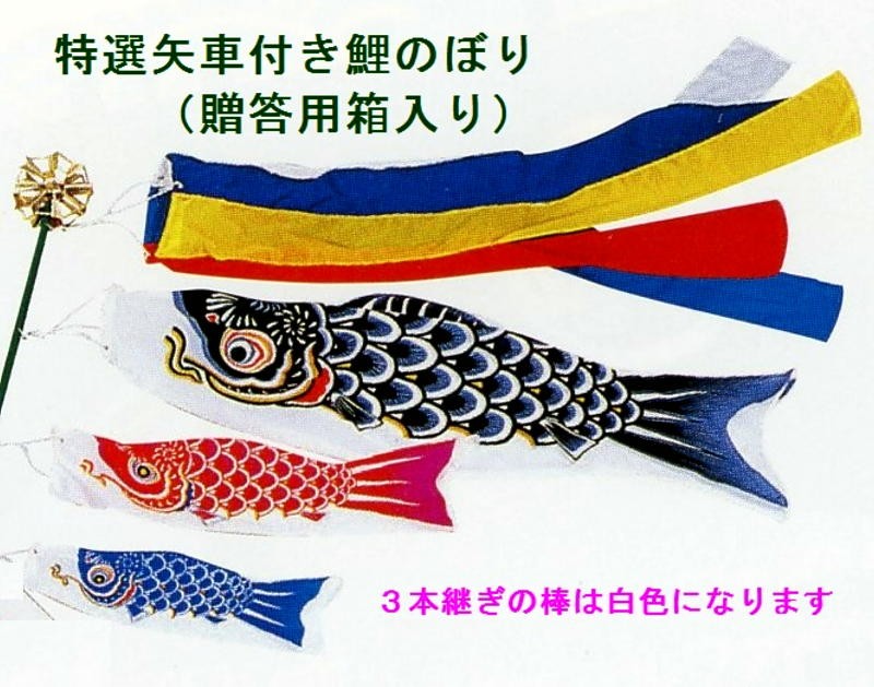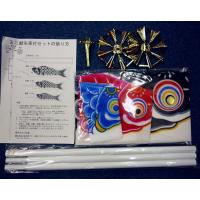 内容:吹流し(ナイロン)・鯉3匹(ナイロン)・3本継ぎ竿(ポリ)・金色矢車(プラ)