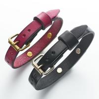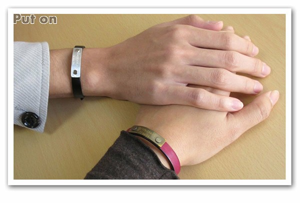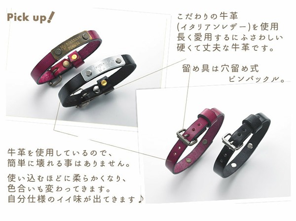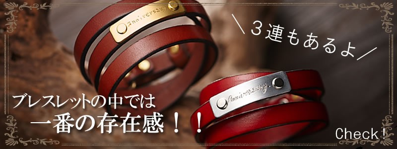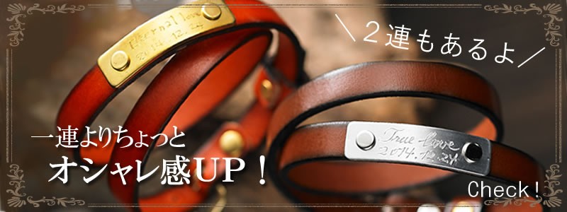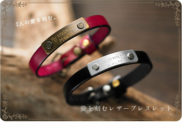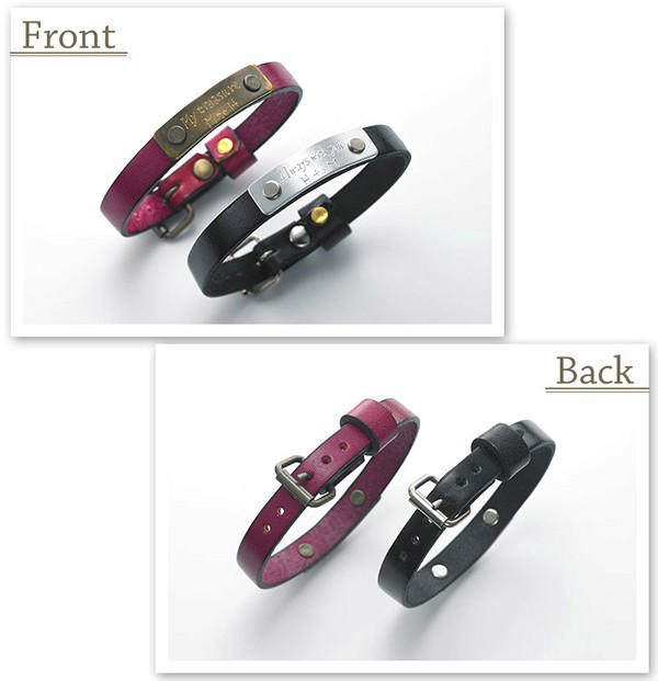 プレート部分にオリジナルのメッセージを刻印できるレザーブレスレット。