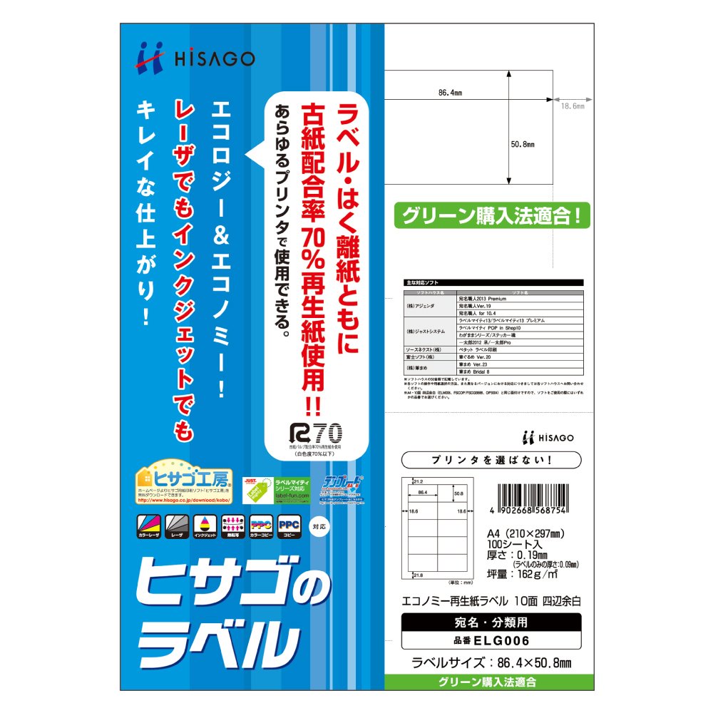 商品名:ヒサゴ ヒサゴのラベル A4 エコノミー再生紙ラベル 10面 四辺余白 100シート ELG006