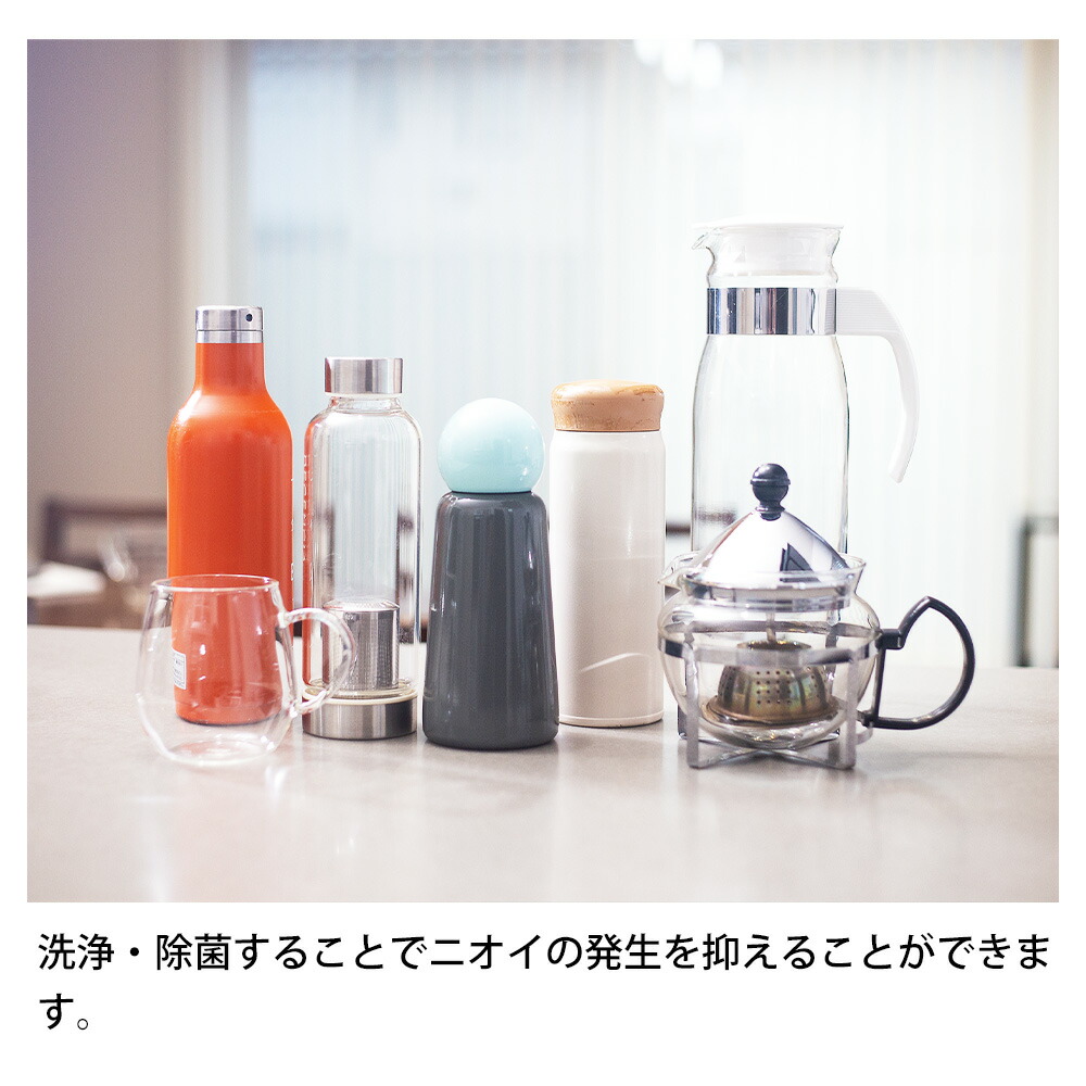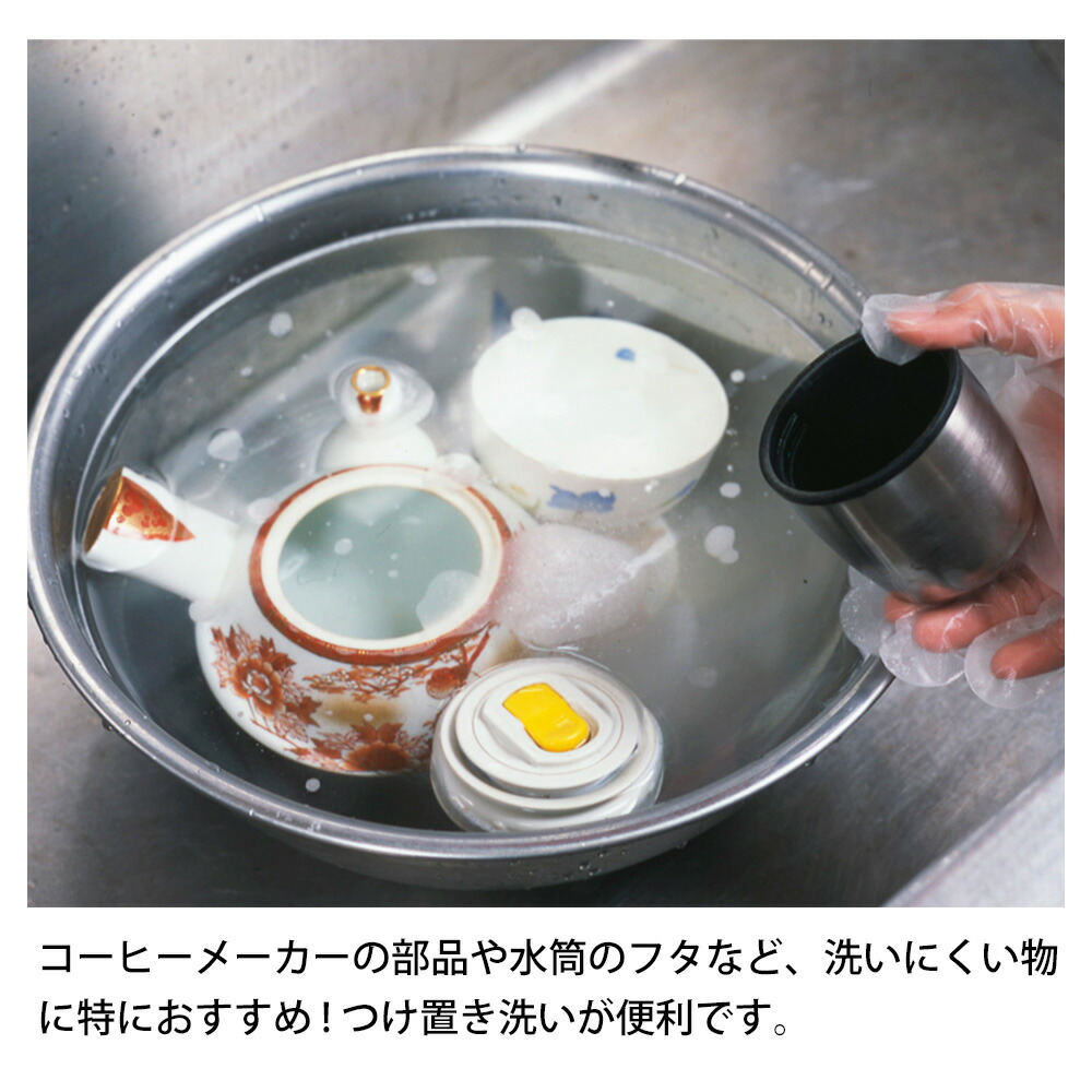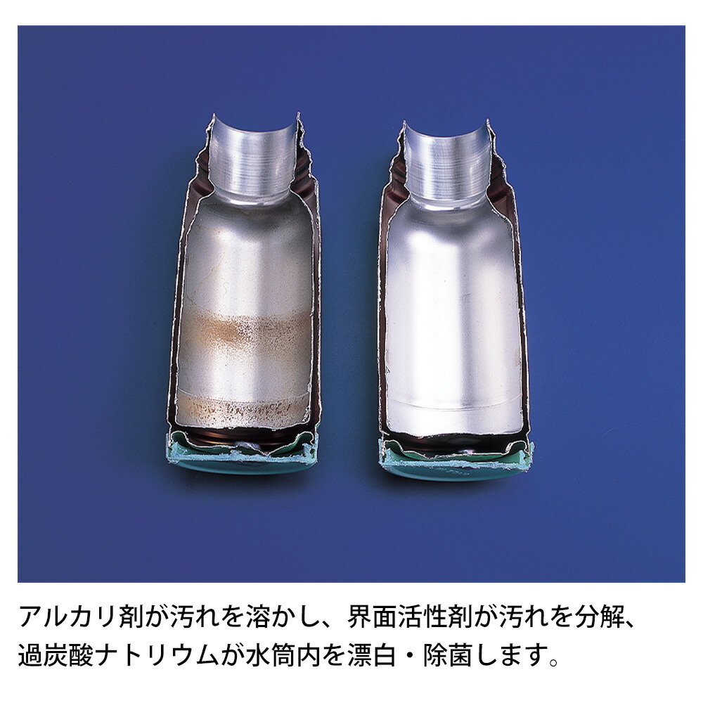 アルカリ剤が汚れを溶かし、界面活性剤が汚れを分解、過炭酸ナトリウムが水筒内を漂白・除菌します。