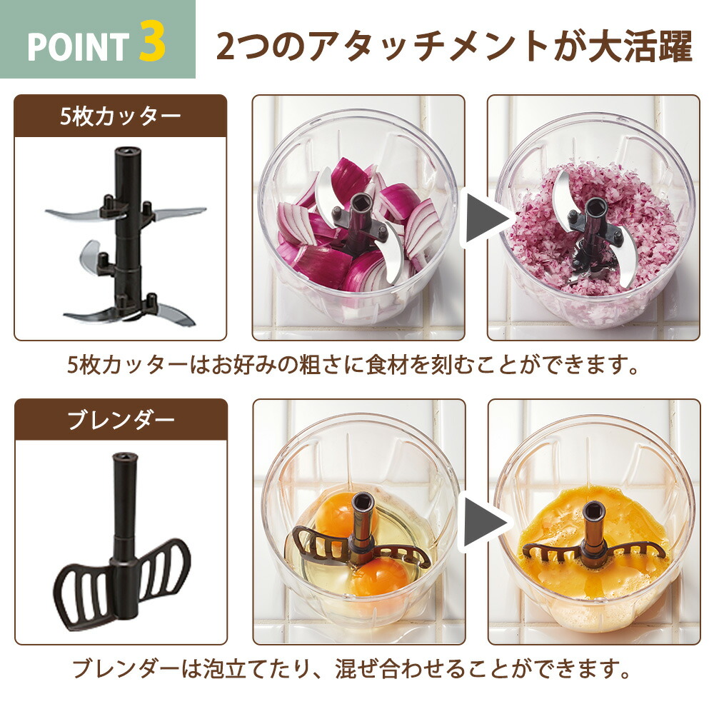 5枚カッターはお好みの粗さに食材を刻むことができます。