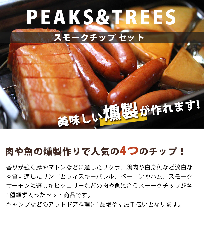 PEAKS&TREES スモークチップ セット サクラ リンゴ ヒッコリー ウイスキーバレル 4種セット