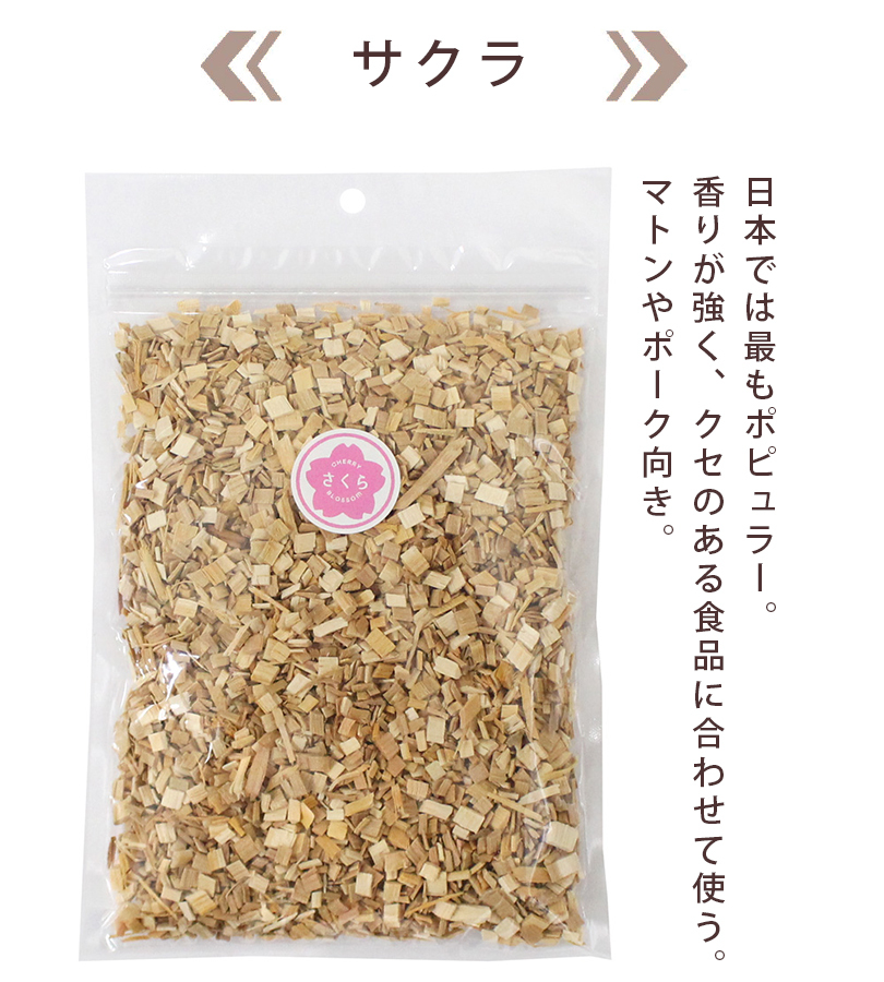 サクラ:一般的で香りが強く豚肉やマトンなどくせのある素材に適しています。