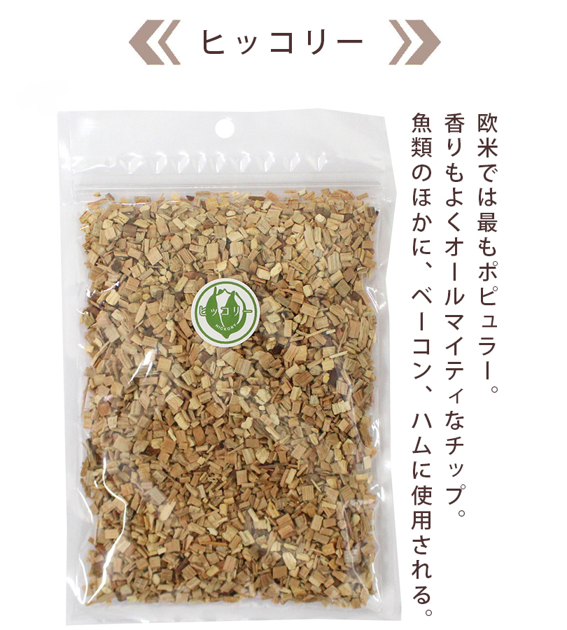 ヒッコリー:欧米では最もポピュラー。香りもよくオールマイティなチップ。魚類のほかに、ベーコン、ハムに使用されます。