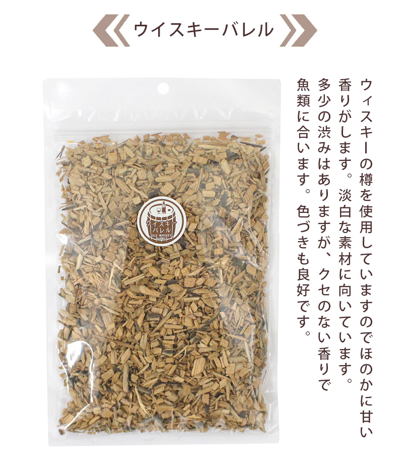 ウイスキーバレル:ウィスキーの樽を使用していますのでほのかに甘い香りがします。 淡白な素材に向いています。多少の渋みはありますが、クセのない香りで魚類に合います。色づきも良好です。 爆買