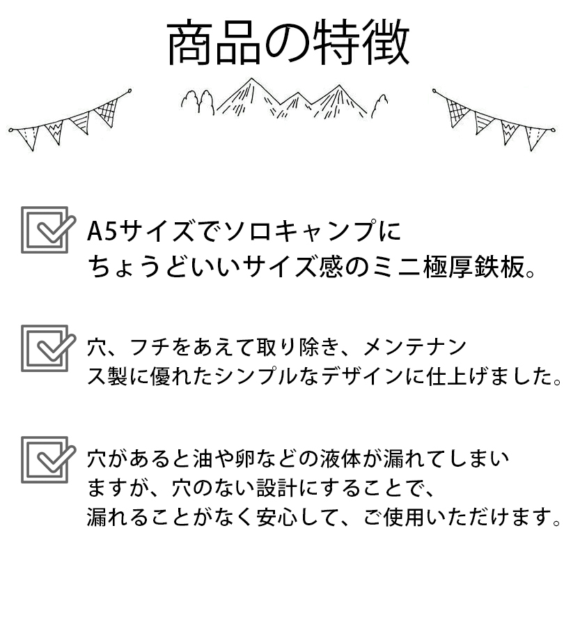 シンプルに食材を焼くことが楽しくなる、A5サイズでソロキャンプにちょうどいいサイズ感のミニ極厚鉄板の登場です。