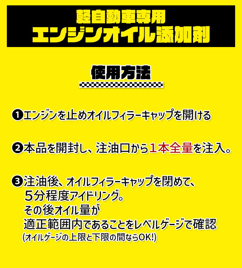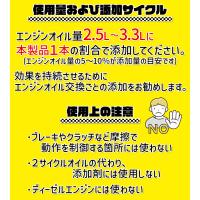 | 注意事項 | ・人体に害がありますので、吸入したり飲んだりしないでください。・ブレーキやクラッチなど摩擦で動作する箇所には絶対に使用しないでください。・室式クラッチのバイク等のエンジンオイルへの添加は絶対にしないでください。・2サイクルオイルの代わり及び添加剤には使用しないでください。オイルが分離し、2サイクルオイルがエンジンに供給されない可能性がございます。・ディーゼルエンジンへの添加は推奨しません。 |