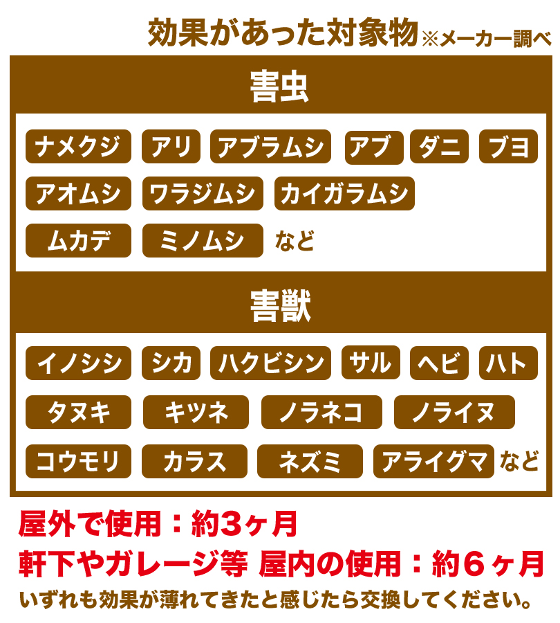 | 注意事項 | ※強い匂いを発しますので取扱時はマスク・ゴム手袋等を着用し、衣類には付着しないように注意してご使用ください。※本品は、農薬取締法に基づく登録を受けておりませんので、農地及び農作物等の病害虫又は雑草の防除のために使用することはできません。※小さなお子様やペットなどの手の届かないところに保管して下さい。※説明をよく読んでからご使用ください。※用途以外の方法には使用しないでください。※万が一、初期不良があった場合は当店にご連絡ください(お客様の不注意・過失の場合はご対応しかねる場合がありますことをご了承ください)※モニターによって色味が実物とやや異なる場合がございます。※生産工程上、微量なサイズ・重量の個体差がある場合がございます。ご了承ください。 |