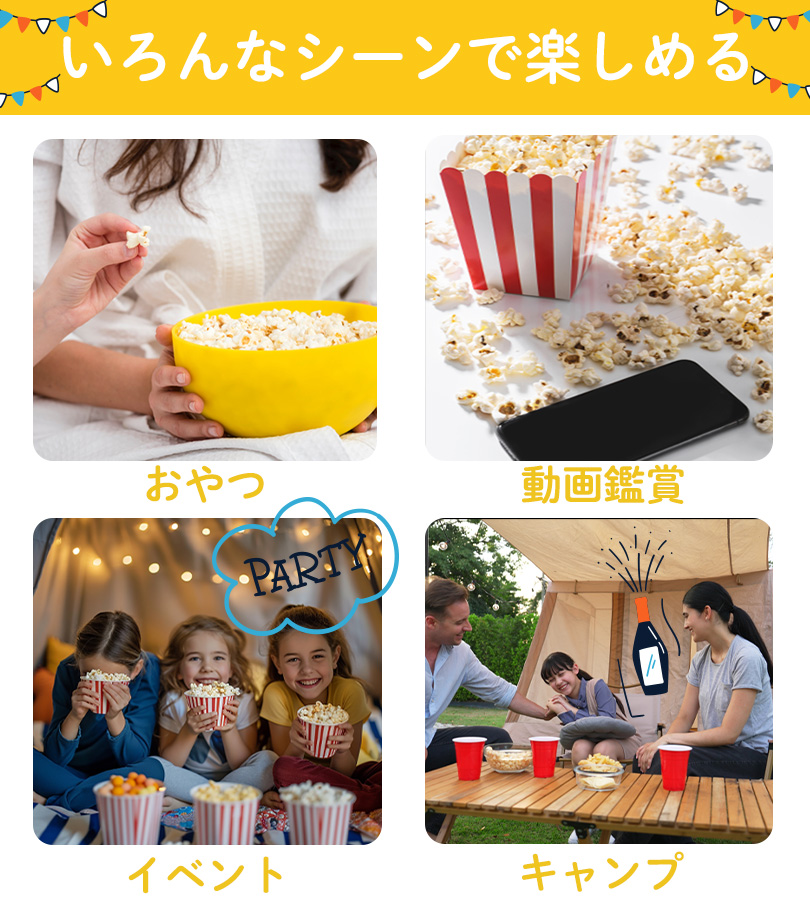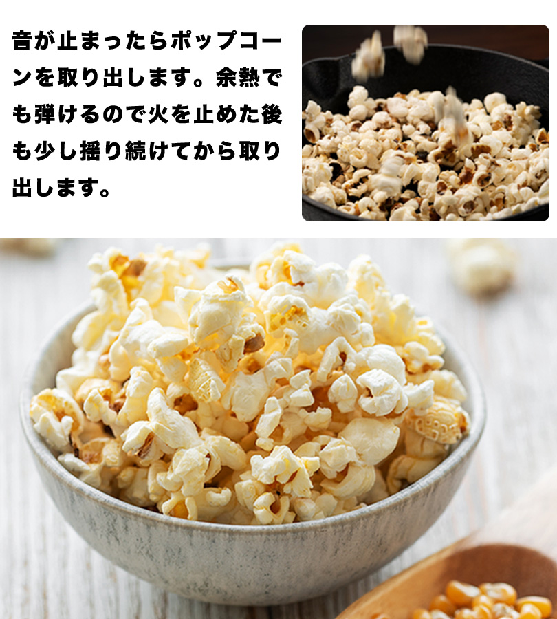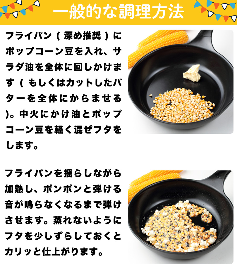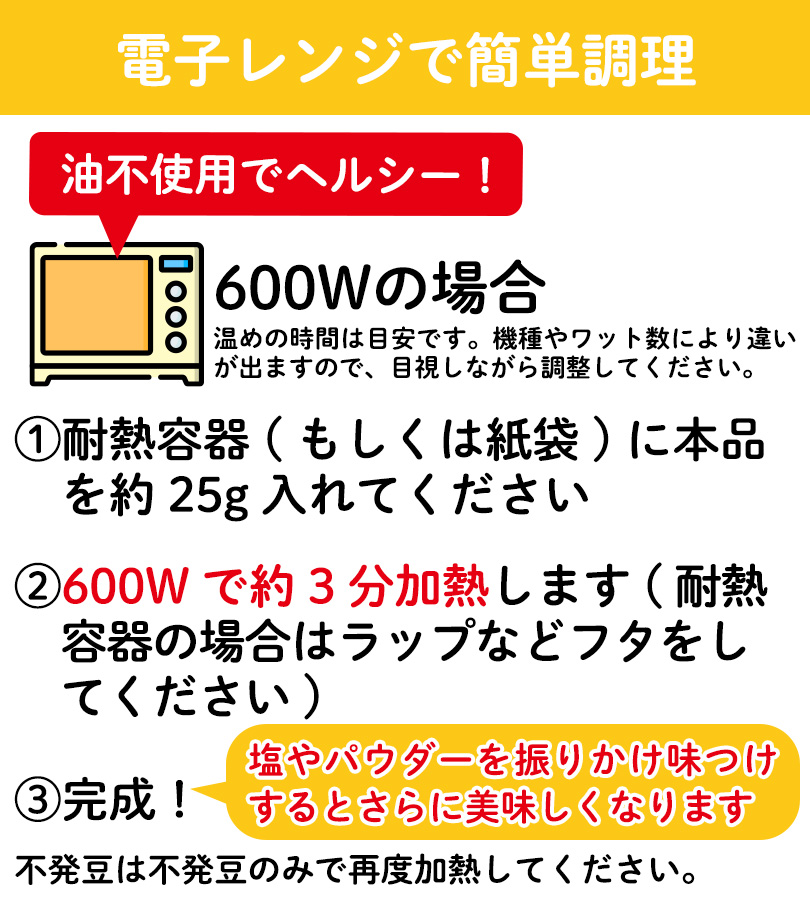 | 注意事項 | ※焦げにつながるので加熱時は放置せず必ず様子をみながら調理してください。※油跳ねなどやけどの原因に繋がる恐れがあるので保護者は小さいお子様が作る場合は目を離さないでください。※不発豆がある場合は不発豆のみ再加熱をしてください。 |