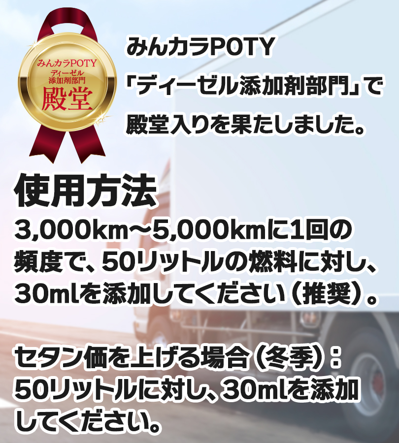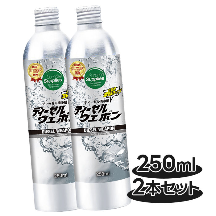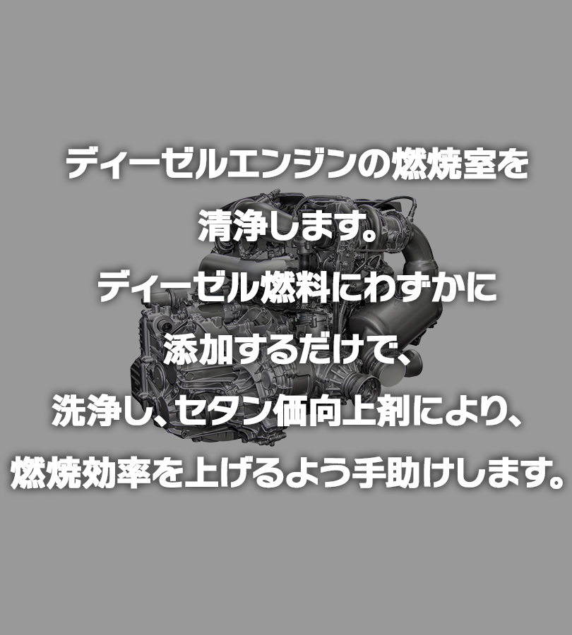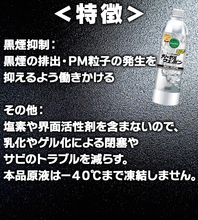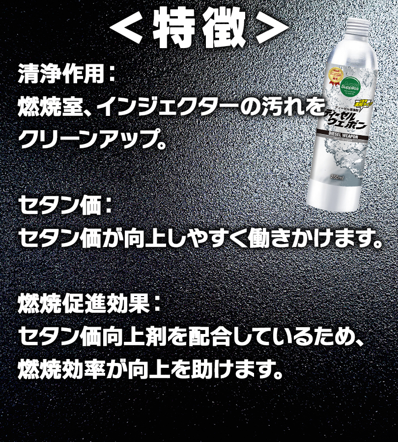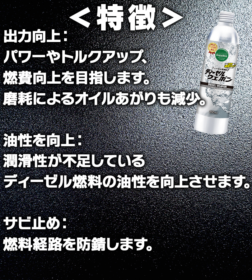 | その他仕様 | 適合車種・機械 ディーゼルウェポンは軽油、灯油、A重油、B重油、C重油、ローサル、およびバイオディーゼル燃料に使用できます。 ディーゼルウェポンは車種・エンジン形式・機械を選ばず、すべてのディーゼルエンジンに使用可能です。 (例)ディーゼル自家用車、乗用車、営業車、トラック、バス、ダンプ、建設・建築・土木機械、農機・酪農・畜産機械、林業機械、漁業機械、砕石業、製造・工場内機械、解体・産廃処理機、グリーンキーパー・整備車両、除雪車、フォークリフト、エアコンプレッサーなど、各種産業機械および車両。いすゞ エルフ、フォワード、ギガ トヨタ ダイナ、トヨエース、ハイエース、コースター、ランドクルーザー、ランドクルーザープラド 日野 デュトロ、レンジャー、プロフィア、リエッセ2 三菱 キャンター、ファイター、スーパーグレート、デリカ 三菱ふそう ローザ 日産 キャラバン、バネット、エクストレイル 日産UD アトラス、コンドル マツダ タイタン、ボンゴ、CX-5、CX-8、CX-3、CX-30、CX-60、Mazda2、Mazda3、Mazda6 その他外国車輸入車 |