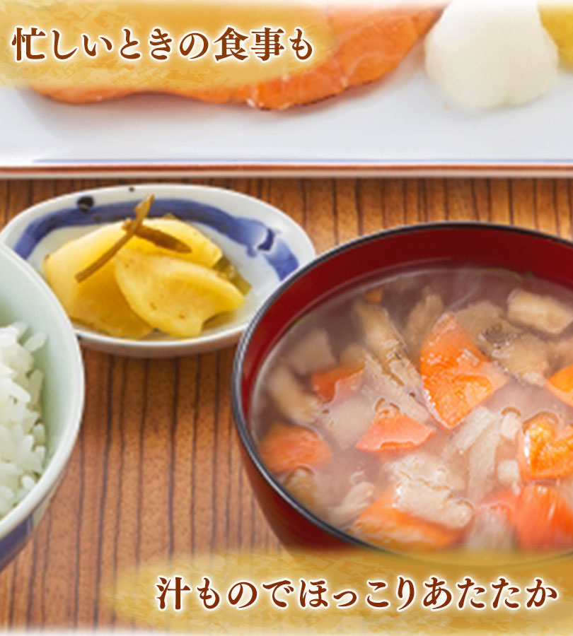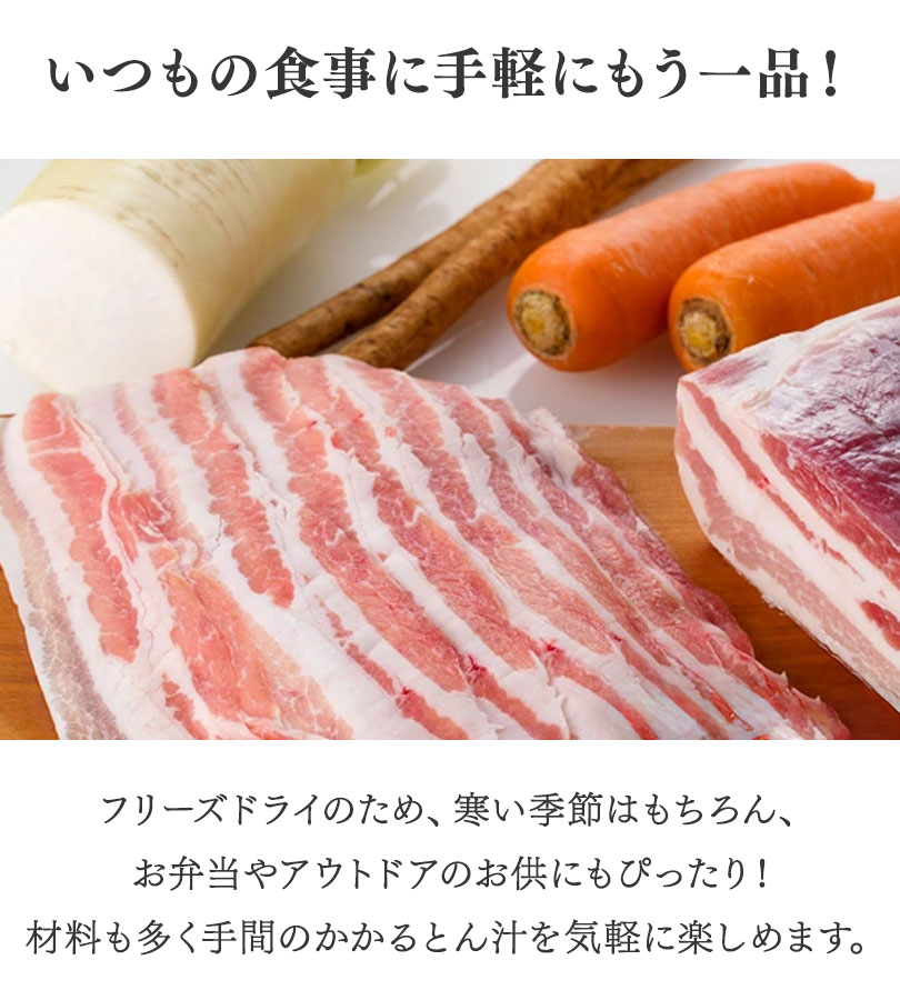 | 原材料名 | 豚肉(スペイン産)、みそ、大根、にんじん、ごぼう、醤油、野菜エキス、澱粉、昆布エキス、ポークエキス、清酒、デキストリン、酵母エキスパウダー、かつお節エキス、砂糖、食塩、椎茸エキスパウダー、ゼラチン/酸化防止剤(ビタミンE)、(一部に小麦、豚肉、大豆、鶏肉、ゼラチンを含む) |
