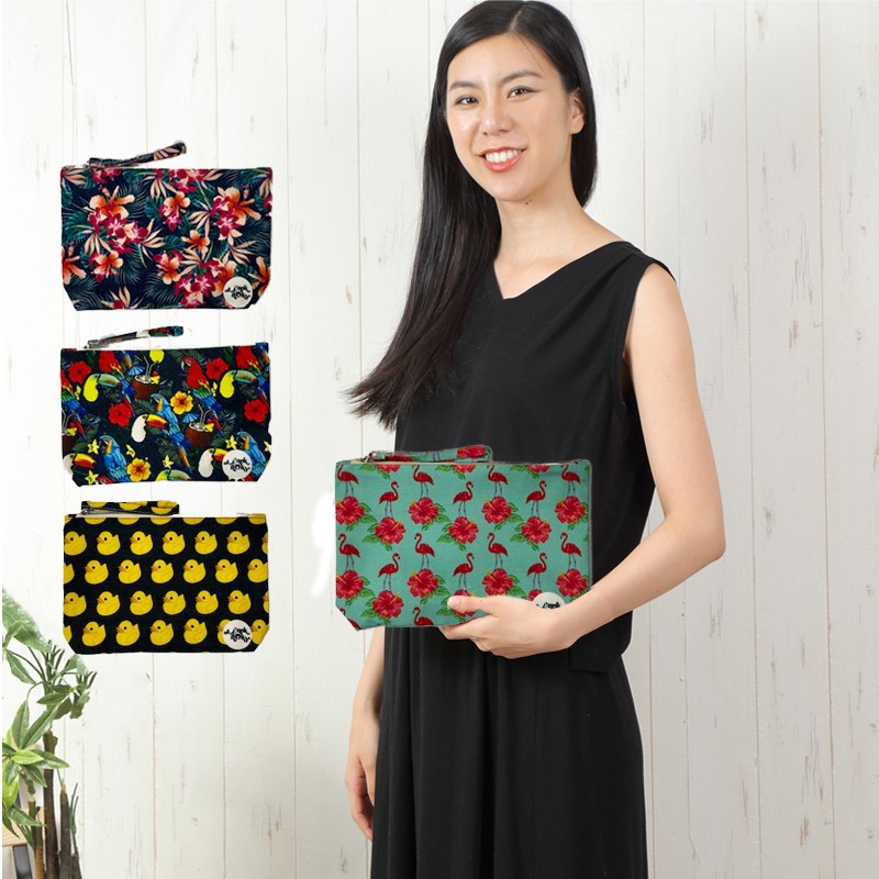 かわいいひよこ柄や南国の花や鳥、フラミンゴやオオハシ、オウムなどが描かれた絵画のようなクラッチバッグ