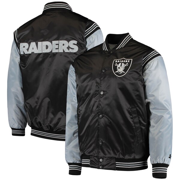 NFL レイダース ジャケット サテンジャケット Enforcer Varsity Jacket ジャケット STARTER ブラック シルバー 2212fsg