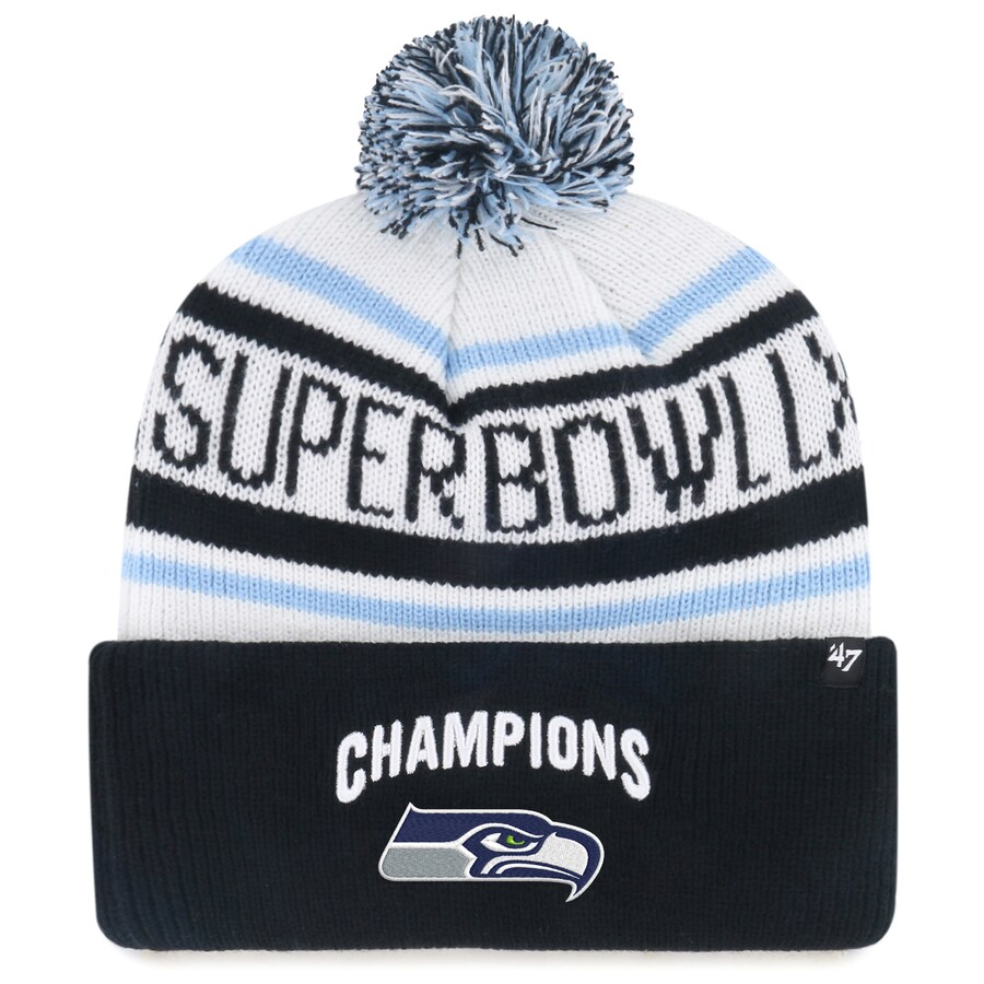 NFL シーホークス ニットキャップ 第60回スーパーボウル優勝記念 Patch Cuffed Knit Hat with Pom 47Brand ホワイト ブラック