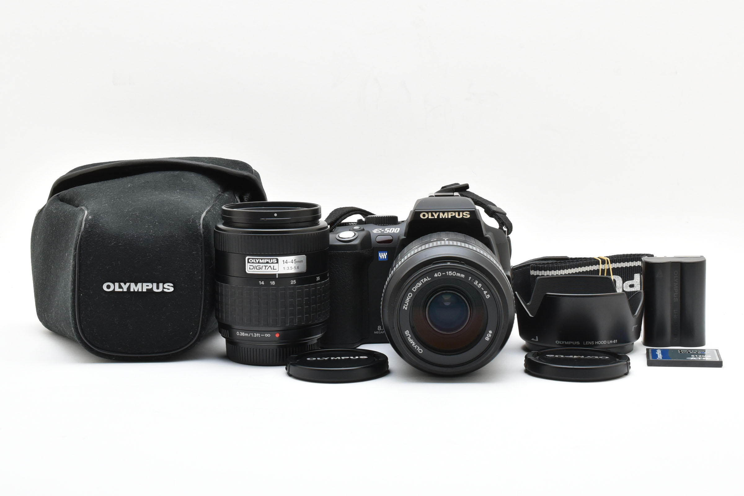 Olympus E-500 800万画素 + Zuiko Digital 14-45mm + 40-150mm Wレンズセット [現状品] ケース ストラップ レンズフード バッテリー付き