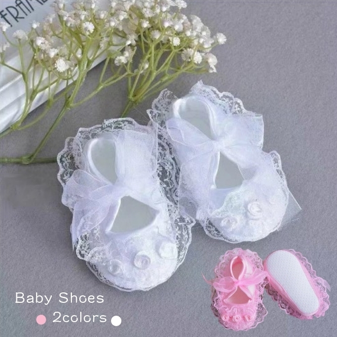 | レースとバラの上品で華やかなデザインのシューズ ソフトな履き心地で柔らかく、軽い素材なので お子さんにも履かせやすくファーストシューズにもオススメです♪ リボンで調整ができるので多少大きくても脱げる心配はありません セレモニードレスに合わせて買うのも◎ |