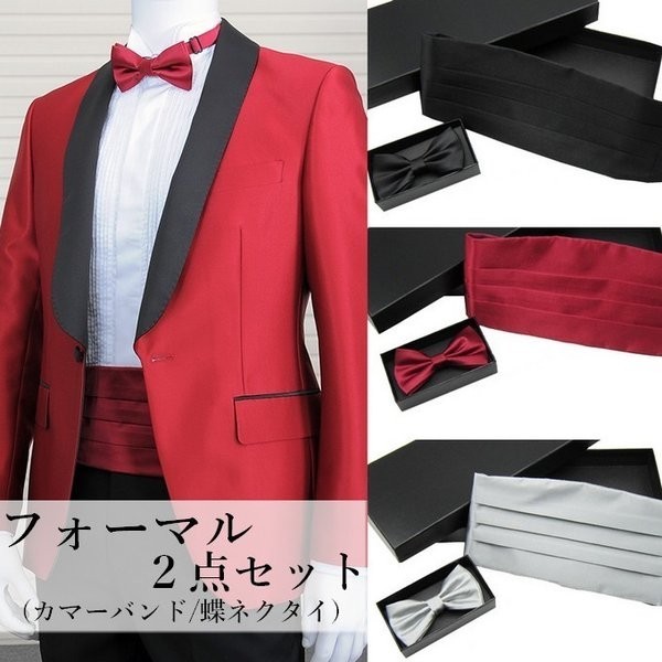 ネクタイと同色でコーディネートを楽しめる、カマーバンド&蝶ネクタイのお得なセット