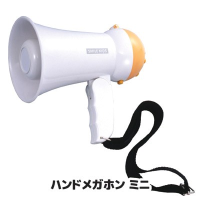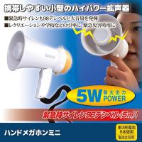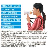 携帯しやすい小型のハイパワー拡声器近年はさまざまなイベントや行事、地域での案内など盛んに活動を行っていただいている方が非常に多くなっています。そんな場面で活躍するのが拡声器(メガホン)です。声を大きく発声できる便利な拡声器ですが、今までは「大きく」「重い」のが欠点でした。本製品は、「超小型」に設計されたハンドメガホンで、歩きながらでも身軽に使うことができます。ミニサイズとはいっても最大出力が5ワットとハイパワー仕様、しかも緊急時用サイレンも鳴らせます(98デシベル)ハンドル部分は折りたたみ式で、肩に掛けることができる肩ヒモもセットされてます。
